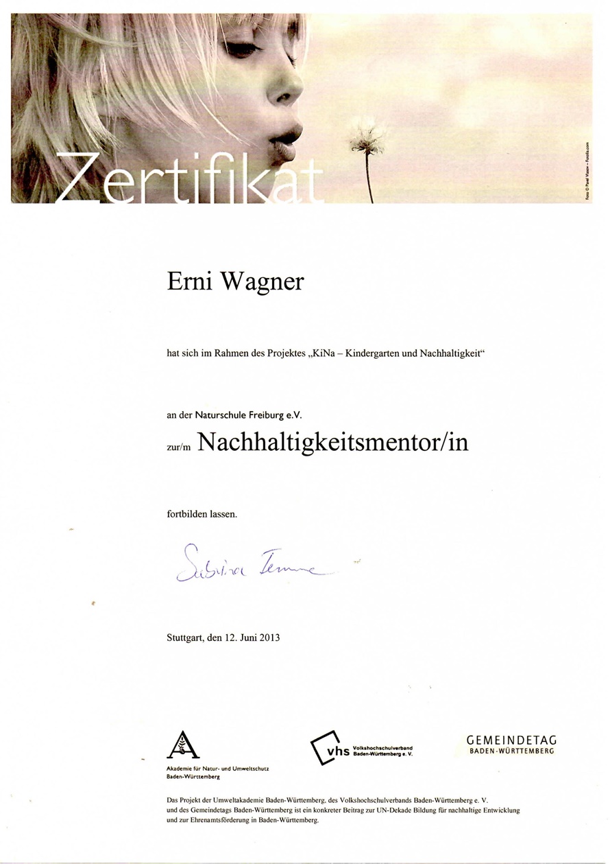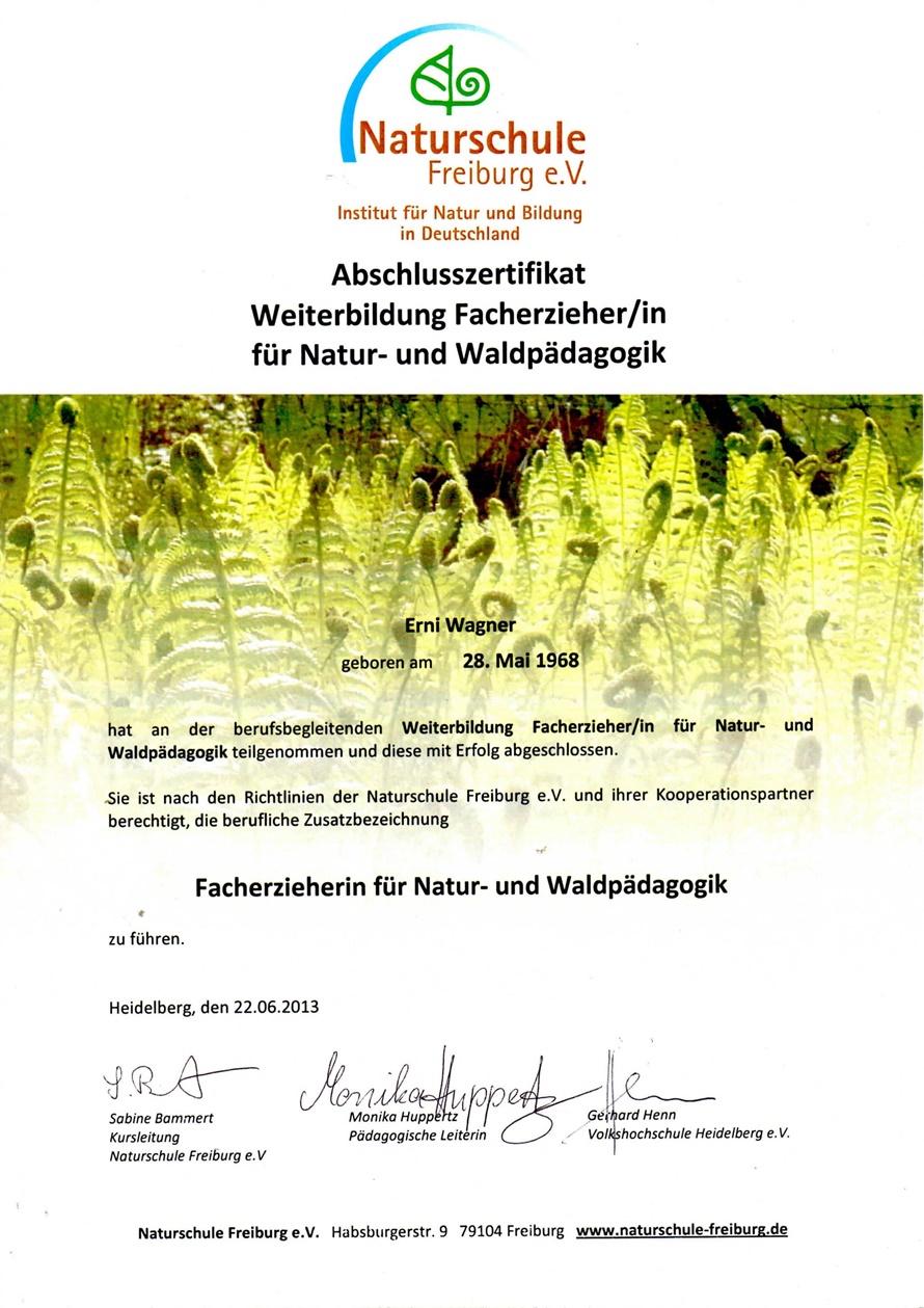 Praktikas in diversen Waldkindergärten, Waldkindergartenmama, Praktikas im CVJM Haus Johannishöhe Otterberg und im Praiseland sowie zahlreiche Weiterbildungen im Rahmen meiner ehrenamtlichen Beratungstätigkeit bei der ökumenischen Arbeitsstelle Kaiserslautern.